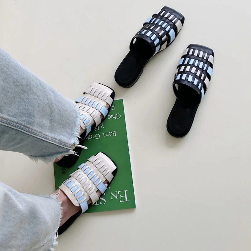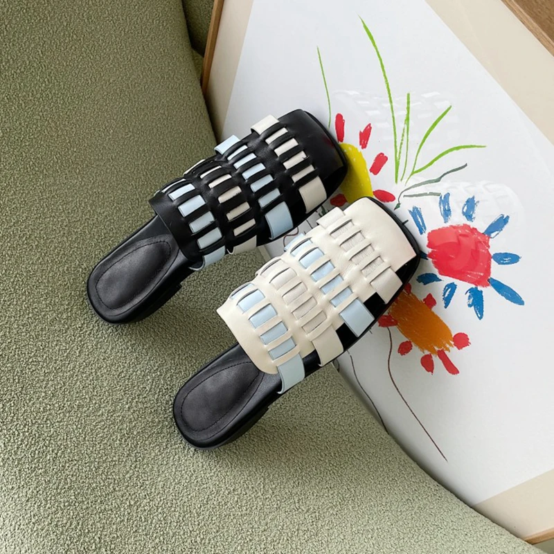 Product Name: REAVE KATZE 2021 Komfort Plus Echtem Leder Damen Hausschuhe Geflochtene Platz Toe Pumps 2cm Chunky Heels US9 Schwarz Weiß A4293