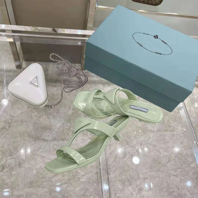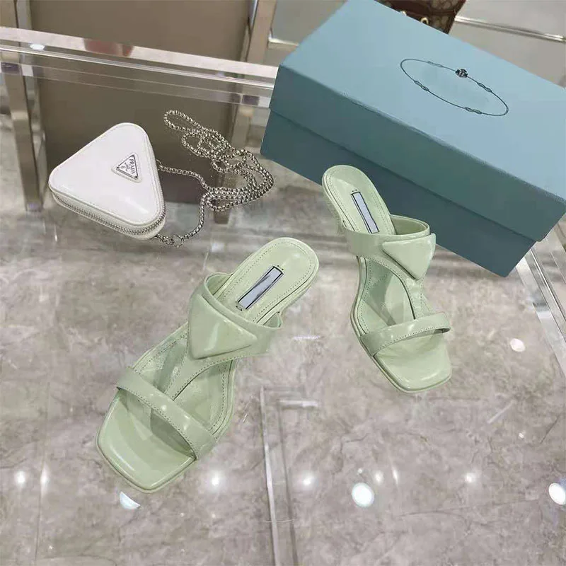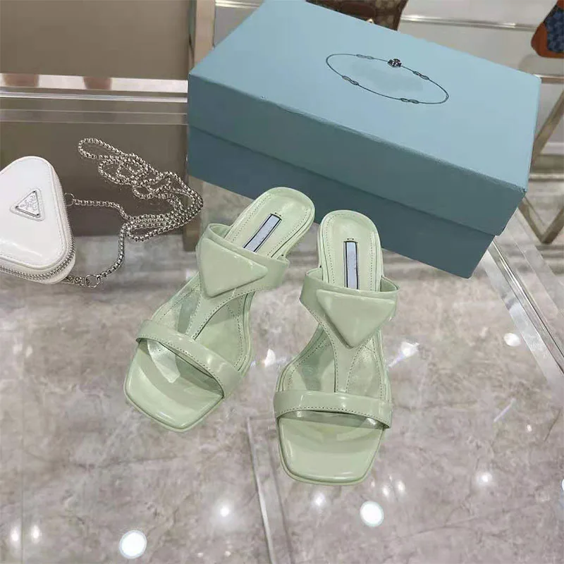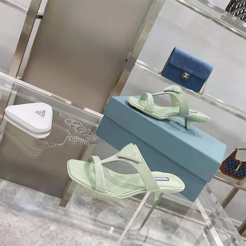 Product Name: Damen Sandalen Katze Mit 3CM Dreieck Logo Square Toe High Heel Frauen Schuhe Pendler Casual Zwei Tragen Luxus Marke Sky Blau