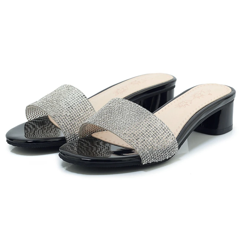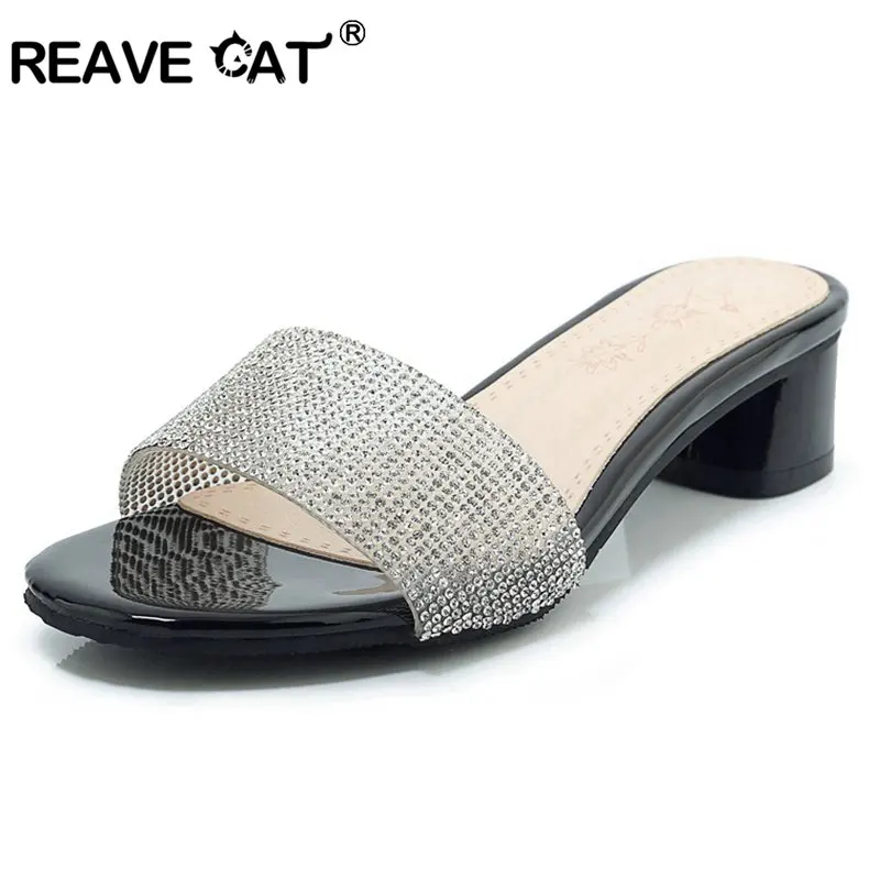 Product Name: REAVE KATZE Nette Frauen Party Kristall Bling Hausschuhe 2019 Sommer Offene Spitze Platz Med Ferse Sandalen Slip Auf Weibliche Strand Schuhe