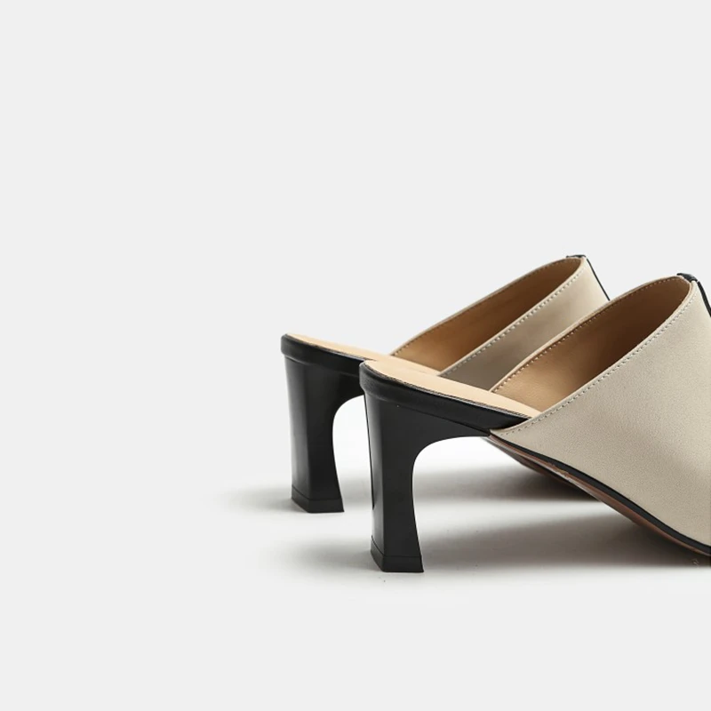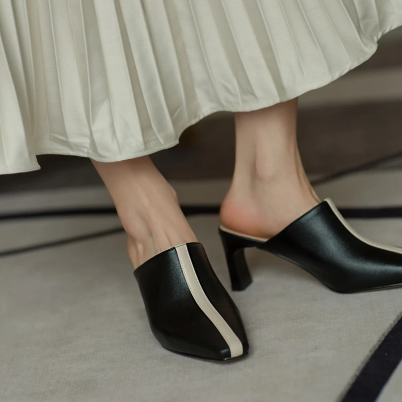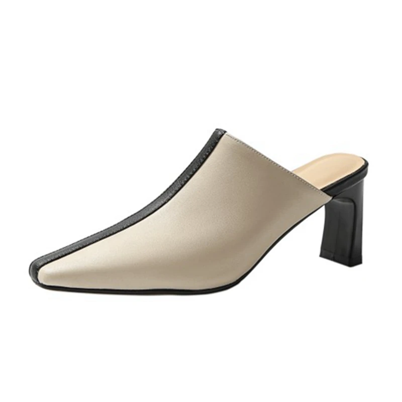 Product Name: REAVE KATZE 2021 Echtem Leder Hausschuhe Halb Ferse Mischfarben Spitz Pumps 7cm Chunky Ferse US9 Schwarz Apricot A4327