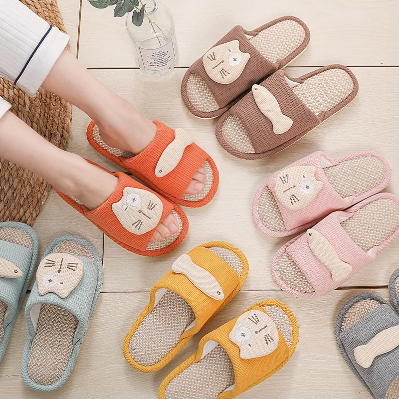 Product Name: Innen Schlafzimmer Paare Casual Hausschuhe Nette Katze Fisch Cartoon Damen Lustige Rutschen Atmungsaktive Neue Frauen Hanf Hausschuhe Nicht-slip