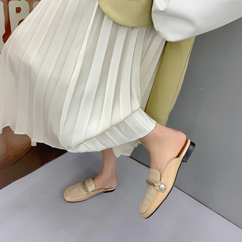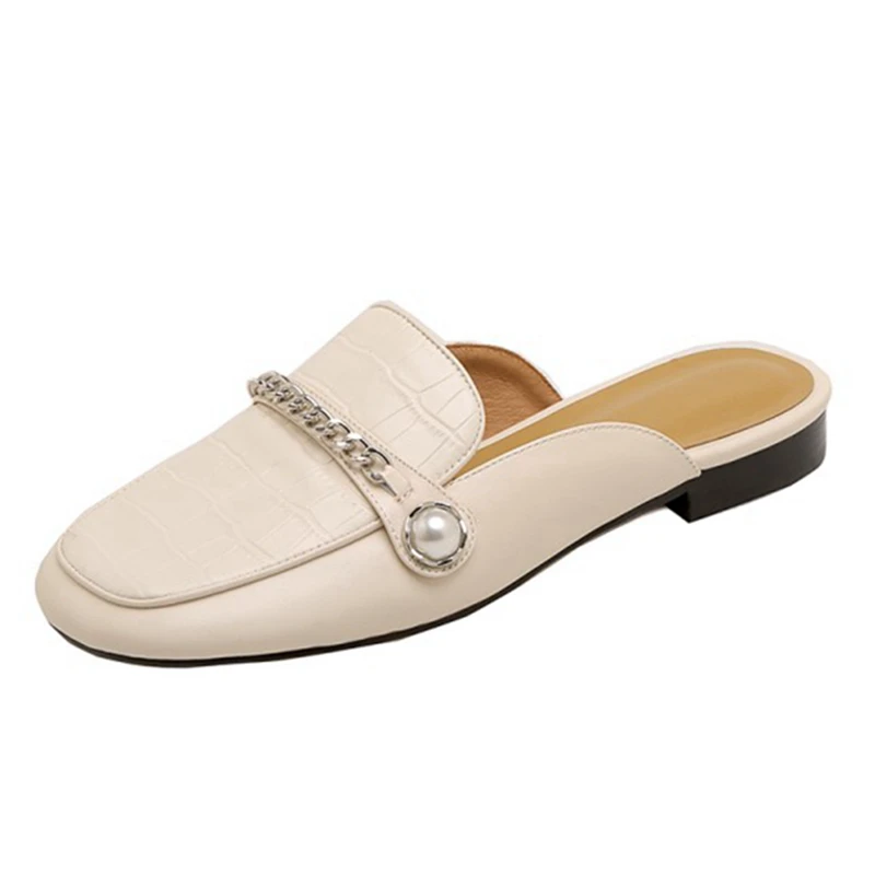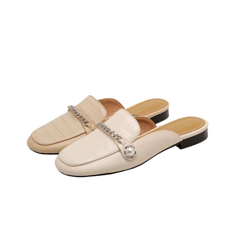 Special Offer REAVE KATZE 2021 Fashion Echtes Leder Damen Hausschuhe Alligator Textur Komfort Plus Perle Ketten Maultiere 2,5 Cm US8 Apricot A4230 Discount (45%OFF) Today!