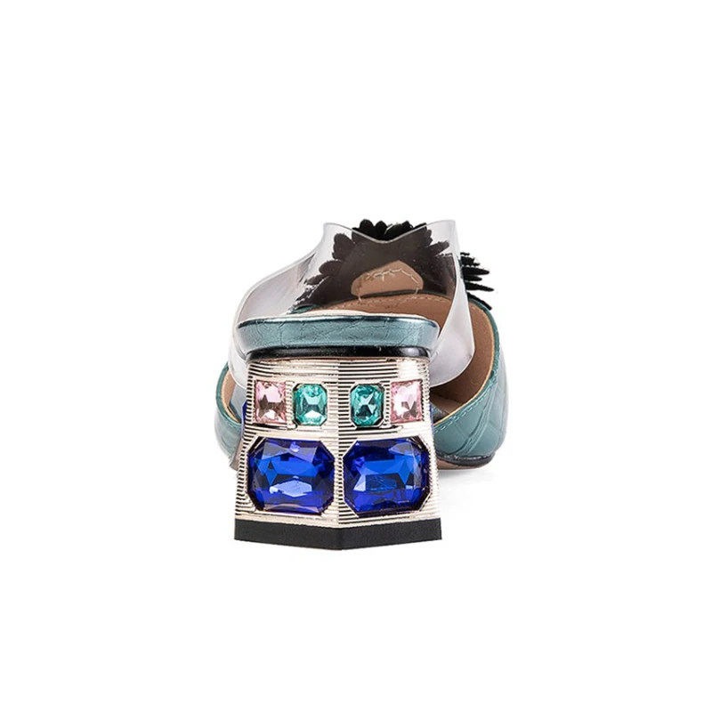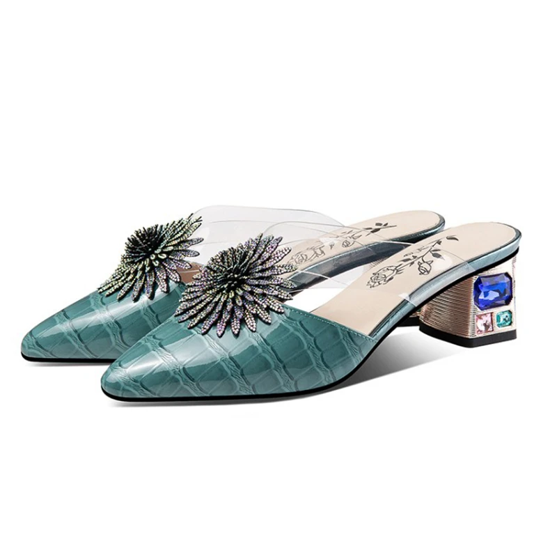 Special Offer REAVE KATZE 2021 Echtem Leder Strass Damen Hausschuhe Alligator Textur Blumen Kristall Seltsame Ferse 4,5 Cm US12 Blau A4235 Discount (45%OFF) Today!
