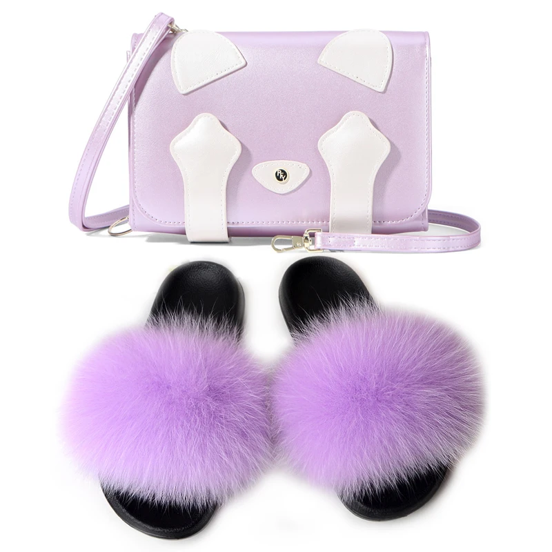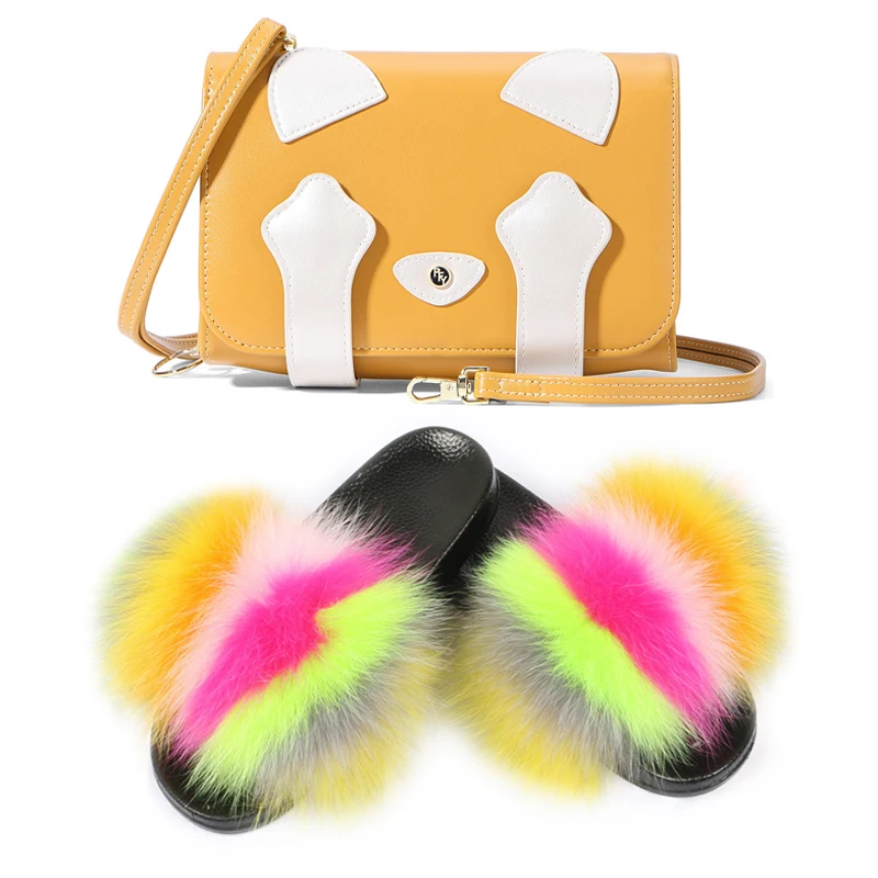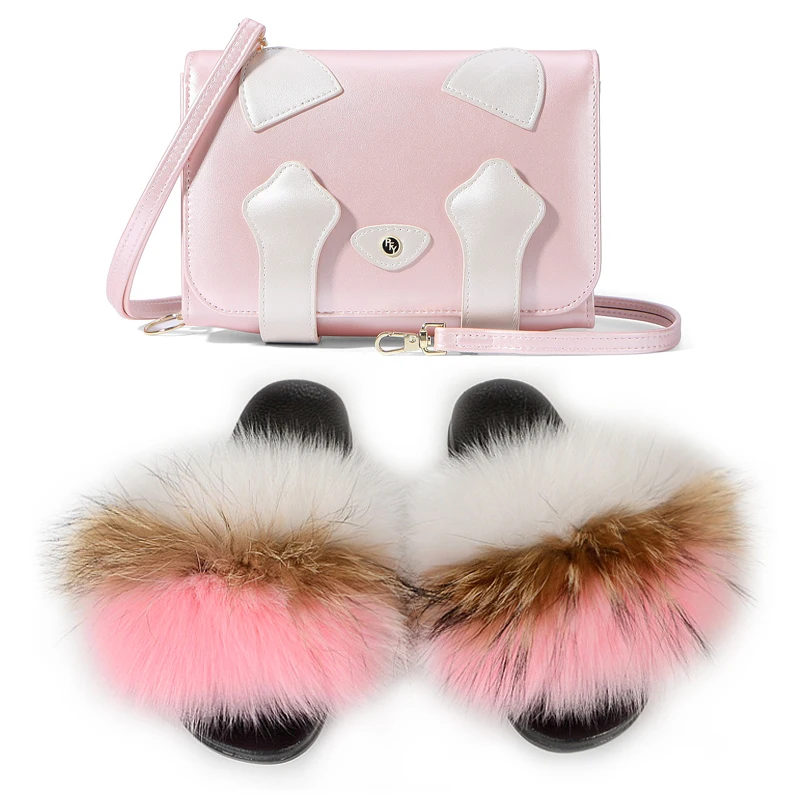 Product Name: Sommer Frauen Echt Fox Fell Hausschuhe Damen Mode Flauschigen Pelzigen Rutschen Mädchens Nette Katze Kleine Quadratische Tasche Set Kinder Schulter Taschen