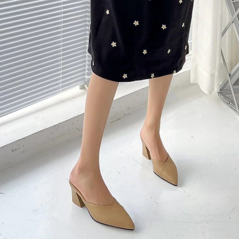 Special Offer REAVE KATZE 2021 Neue Concise Halb Chunky Ferse Frauen Sandalen Pumps Hausschuhe Spitz Slip Auf 6,5 Cm US15 Schwarz Apricot A4197 Discount (49%OFF) Today!